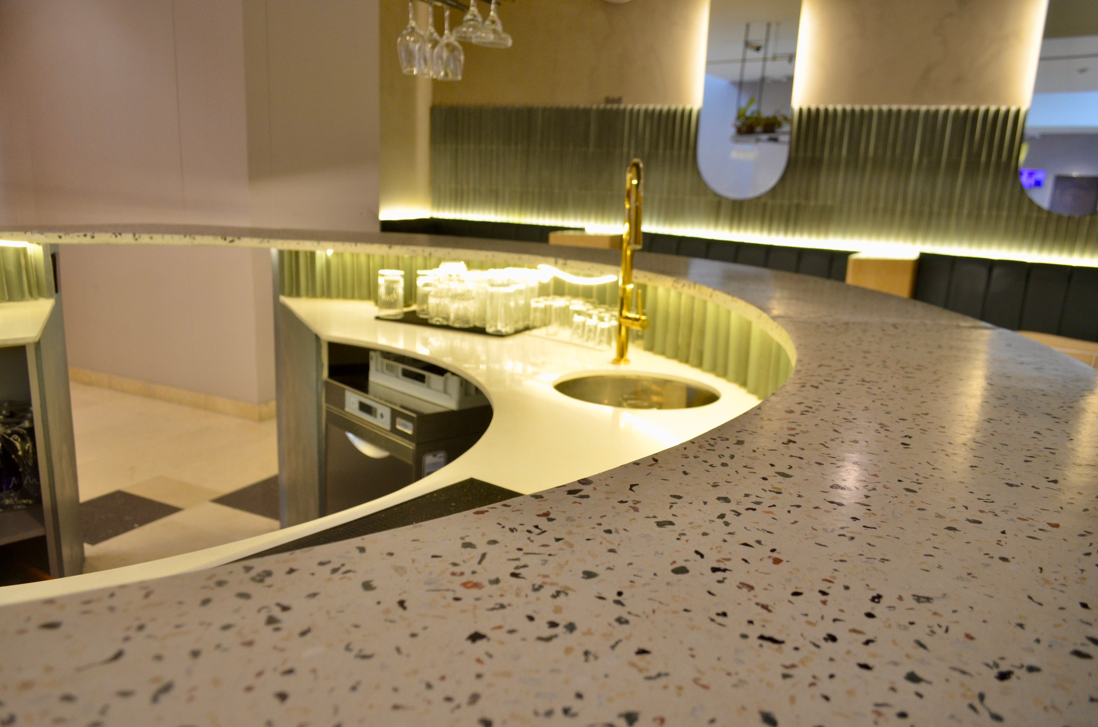 Para este proyecto fabricamos una imponente barra de 3mt de diametro, junto con unas mesas pequeñas que complementan este espacio.